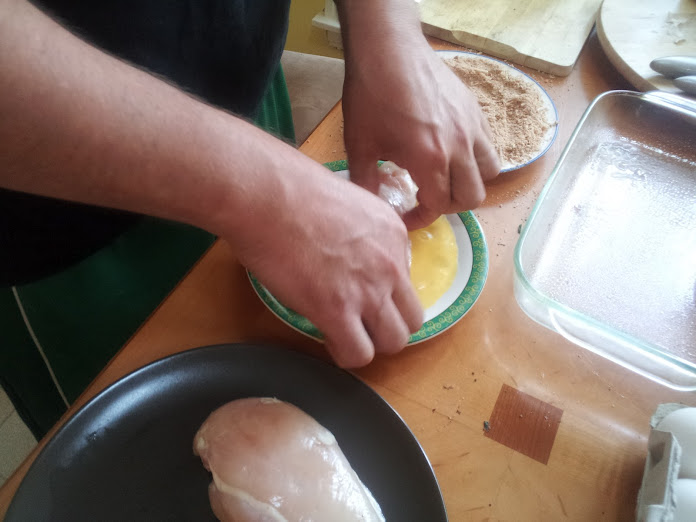 So, as you can see in the action shots (photo credits go to the wife here), one just tries to dry the chicken as best as possible, and then dip it in the yellow snot that is a scrambled egg. I then tried to hang as much of the almond/cheese gravel as I could on the chicken before baking it. During baking, when I flipped the chicken I used the leftover almond/cheese mixture to sprinkle on top of the chicken, as it had gotten kind of pasty. I'm looking for a crispy chicken breast, after all! I baked the chicken for 35 minutes, before finishing it off with roughly 5 minutes of high broil, in an effort to achieve maximum crispiness.