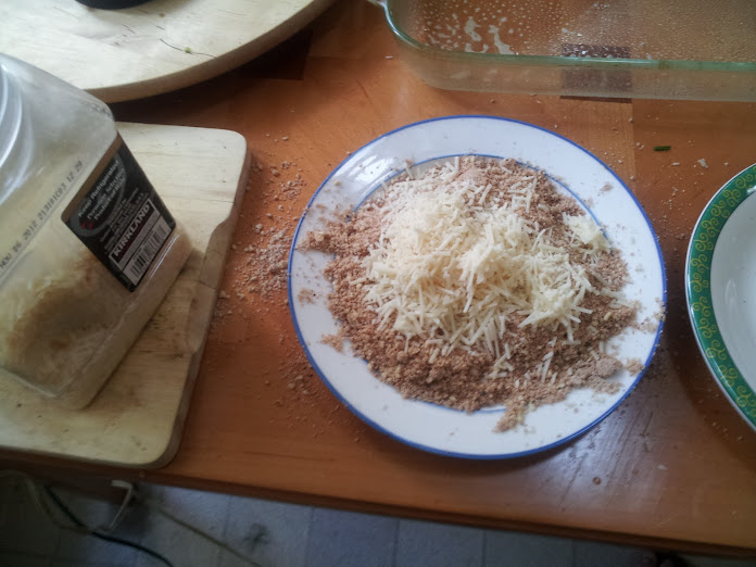 I would've loved to have gotten some fantastic cut of meat for this dish, perhaps some lamb shank or something and grilled it, but part of my desire in writing this blog is to demonstrate that, within in a reasonable budget, can be had fantastic, healthy food. So, one of the staples around our house is Costco brand frozen, individually wrapped chicken breasts. Easy, and relatively healthy. I'd love to say that they are free range, organic, locally grown chickens, but alas. I did want to do something a little more fancy than just grill or broil some chicken, so I decided to "bread" them with almonds, cheese and spices and then bake them. Components:
