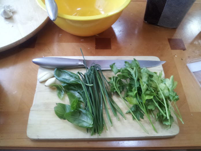 Okay. Basil is one of my favorite things. I use it generously in many dishes, and to have multiple plants producing one tasty leaf after another is the primary goal of even having a garden. And basil, the Bilderberg group of my garden, is the inspiration of what I am making for dinner tonight.
