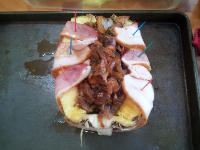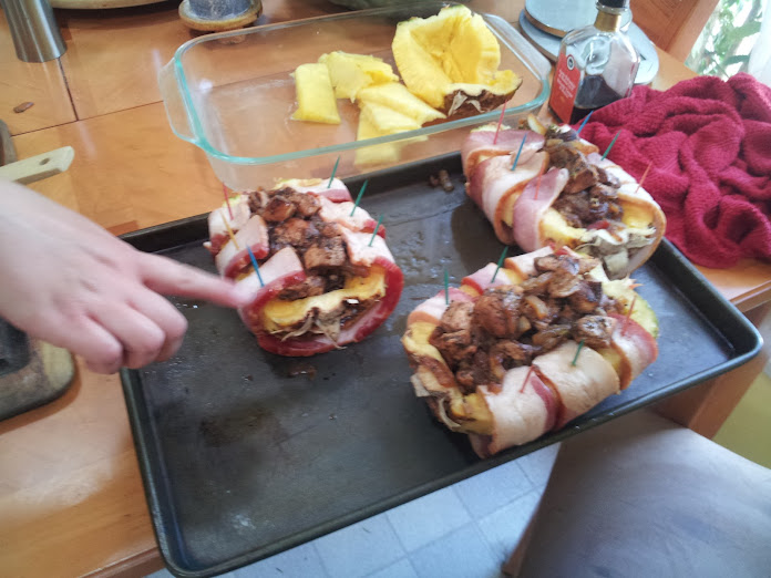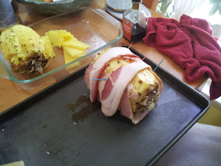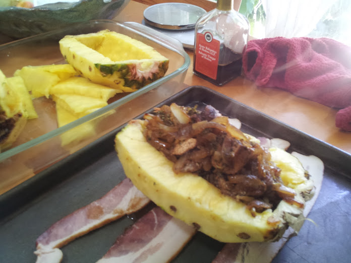 Last week I stuffed pork with bacon and cheese. This week, I'm gonna stuff pineapple with chicken and onions and wrap it in bacon.