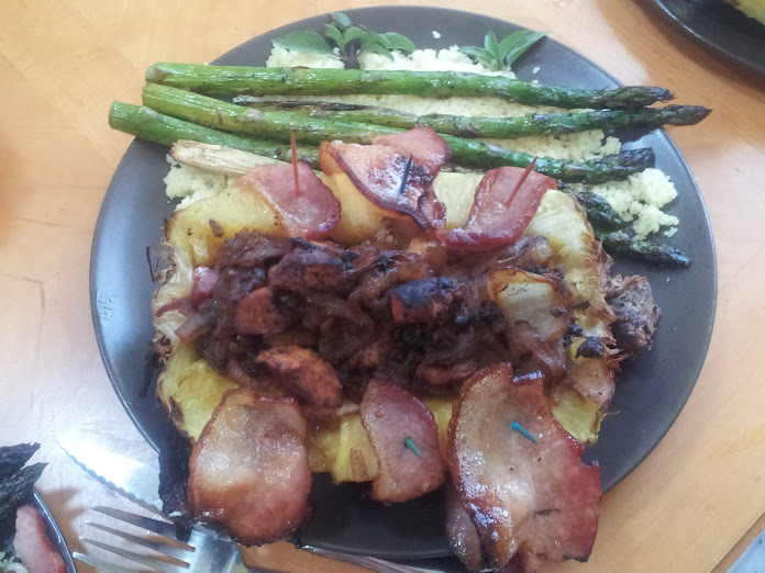 Initially, my wife and I were having two dinner guests, but, one was not able to make, leaving only three. This was good only in that I ruined one of the pineapple halves. This is why there are only three on the grill.