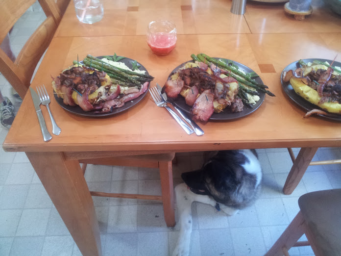 The finished, plated product, with an expectant, scrap hungry dog ready and waiting: