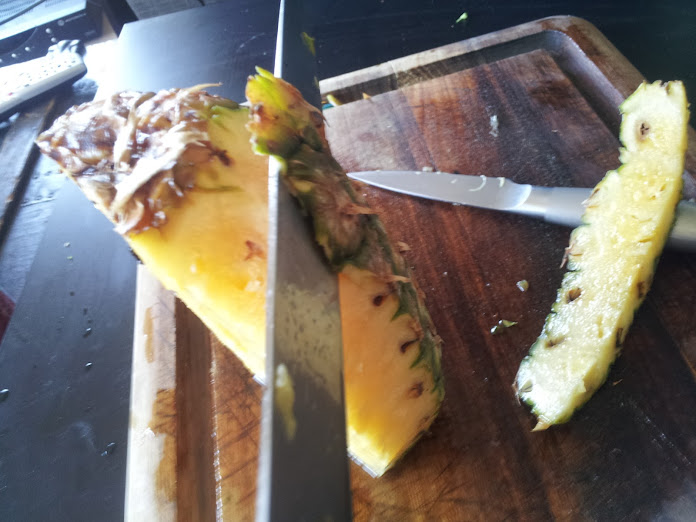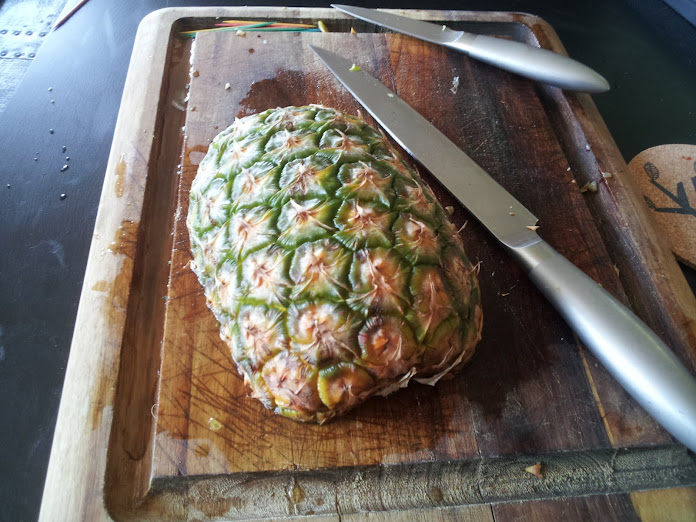 Idea #2: Halve the pineapple, core it, slice the rind off, try and attach the pineapple together with toothpicks that will also attach the bacon.