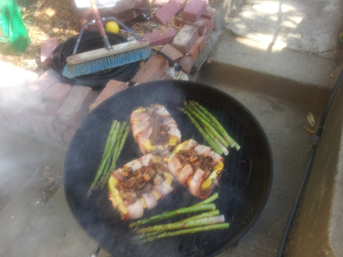 I would love to own a smoker. However, if I didn't know better, I would have thought that I was using a smoker tonight (sorry neighbors!) This is really no surprise, considering that there was pineapple juice, bacon grease, asparagus oil and leaking stuffing ooze all dripping down onto the coals. When I used to roast coffee for a living, there were multiple times that the fire department arrived, having been called by a passer-by seeing all the smoke, ready to put out the flames. For all of you out there who are considering starting a coffee roasting business, all I can say is that you had better become friends with the local FD. Send them away with bags of coffee and drinks -- at least then they aren't pissed at having to suit up and come out for nothing.